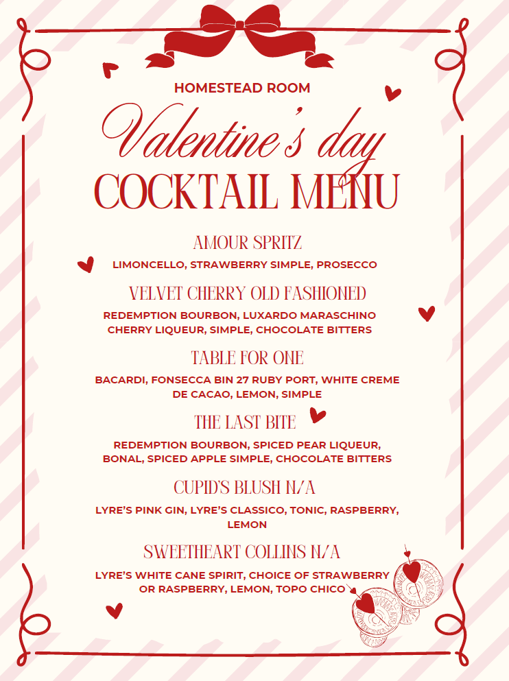 A little indulgence and a little romance. Join us for a Valentine’s Day prix fixe menu and a limited cocktail lineup worth sharing.